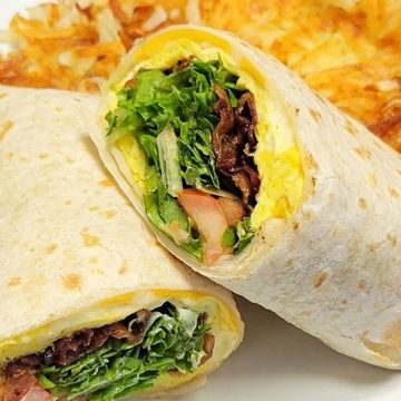 Scrambled Eggs, Bacon, Lettuce, Tomato, Mayonnaise & American Cheese rolled in a grilled Flour Tortilla. Served with Hash Browns.