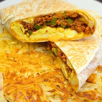 Chorizo, Scrambled Eggs, Onion, Green Pepper, Tomato and Cheddar Cheese. Served with a side of Hash Browns, Salsa & Sour Cream.