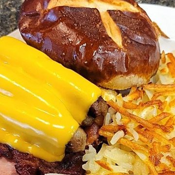 Dearborn Ham, Sausage, Bacon, American Cheese and Egg on a Pretzel Bun. Served with Hash Browns.