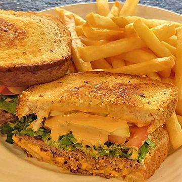 Fresh Burger, American Cheese, grilled Onions, Lettuce, Tomato, Pickle and Smash Sauce on grilled Rye Bread. Served with Fries.
