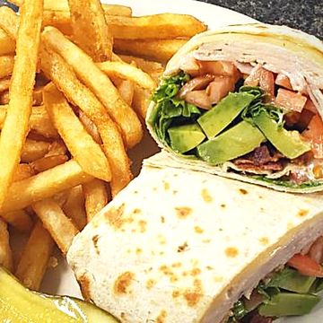 Turkey, Avocado, Bacon, Swiss Cheese, Lettuce, Tomato and Mayo in a grilled Flour Tortilla. Served with Fries.