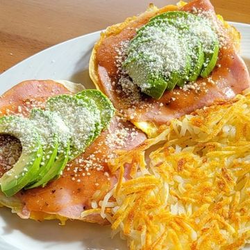 2 Tostadas with Egg, Ham, homemade Tomato Sauce, fresh Avocado and Cotija Cheese. Served with Hash Browns and Sour Cream.