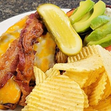 Grilled Chicken Breast, Bacon, Colby Jack Cheese, Cream Cheese Spread, Avocado, Tomato & Red Onion served with Chips and a Pickle. Served on a Brioche Bun.