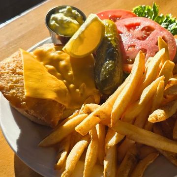 Pub-battered Alaskan Pollock Fillets topped with American Cheese, Lettuce and Tomato on a grilled Brioche Bun. Served with French Fries, Tartar Sauce and Lemon.
