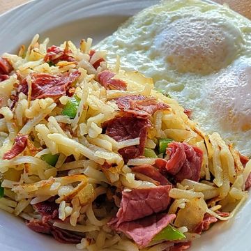 Chopped Deli Corned Beef, Hash Browns made with grilled Onions and Green Peppers & 2 Eggs. Served with your choice of Toast.